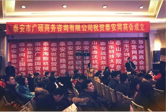 2015年1月26日,泰安市網(wǎng)商協(xié)會成立大會在泰安寶龍福朋酒店隆重舉行。參會的有泰安市政府領(lǐng)導(dǎo)、泰山區(qū)區(qū)委書記和阿里巴巴北方區(qū)域、泰安市商務(wù)局、泰山區(qū)商務(wù)局、市建行、泰山學(xué)院、山東科技大學(xué)、市外網(wǎng)商會等多家單位的主要領(lǐng)導(dǎo)以及泰安網(wǎng)商會全體會員。