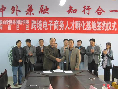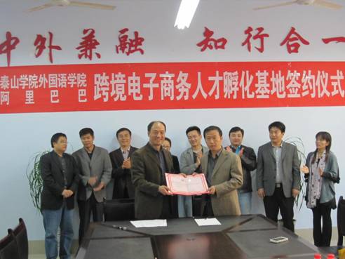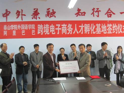 2014年10月22日,泰山學(xué)院外國語學(xué)院阿里巴巴跨境電子商務(wù)人才孵化基地簽約儀式,在泰山學(xué)院外國語學(xué)院舉行。泰山學(xué)院外國語學(xué)院的書記、院長和阿里學(xué)院的院長及泰安網(wǎng)商會理事單位的主要領(lǐng)導(dǎo)參加了簽約儀式。泰安海數(shù)公司作為泰安網(wǎng)商會的理事單位參加了簽約儀式,蘇總參加了簽約,并接受了大學(xué)生就業(yè)創(chuàng)業(yè)孵化基地導(dǎo)師聘書和大學(xué)生實習(xí)就業(yè)協(xié)議單位授牌。